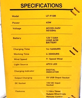 | نوع | پنکه شارژی چندکاره AC/DC |