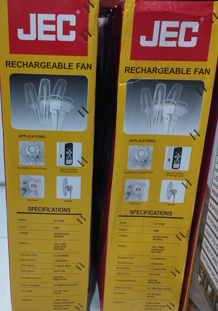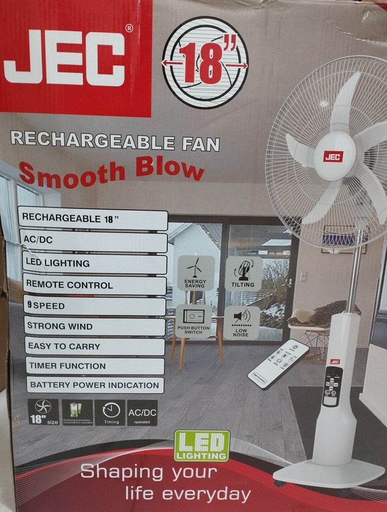 پنکه شارژی ۱۸" JEC LF-910R یک پنکه چندکاره، پرقدرت و هوشمند است که تجربه خنکی را در خانه، دفتر کار یا سفر فراهم میکند. این پنکه AC/DC و شارژی بوده و با نور LED و کنترل از راه دور امکاناتی فراتر از یک پنکه معمولی ارائه میدهد.