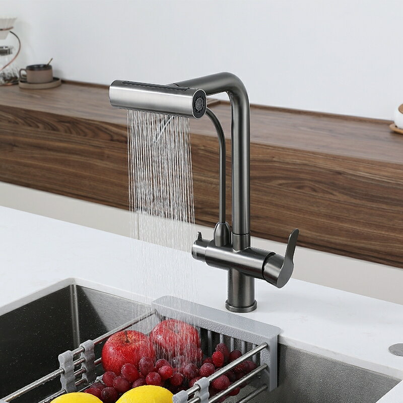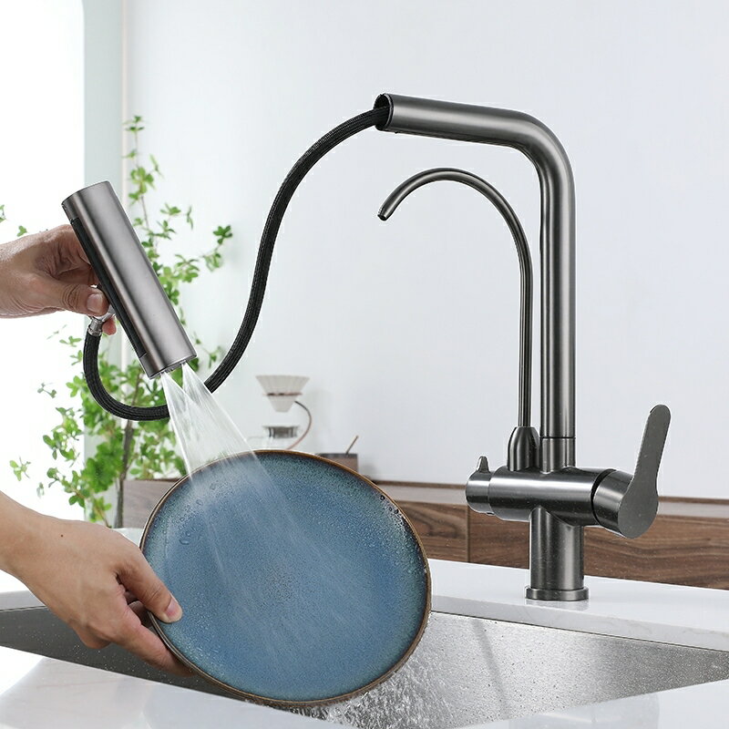 شیر ظرفشویی دومنظوره شاوری HuaDiao مدل 409چکشی یک راهحل هوشمندانه و حرفهای برای آشپزخانههای مدرن است که میخواهند هم آب شهری برای شستشو و هم آب تصفیه برای شرب یا شستشوی بهداشتی را از یک شیر واحد داشته باشند.